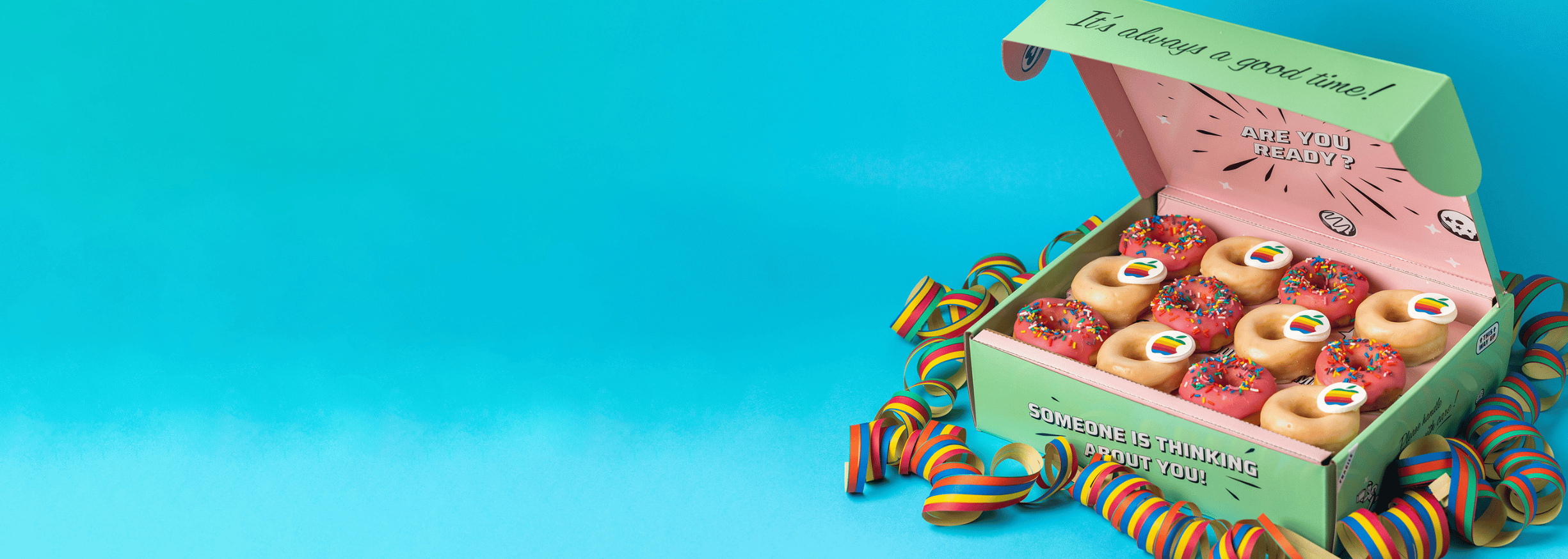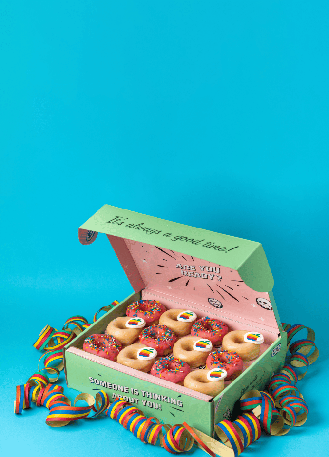 We are happy to add an edible topper with your logo to the donuts and match the color of the glaze. Customised packaging is also possible