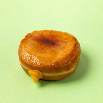 🌱 VEGAN - Crème brûlée donut filled with vanilla cream and topped with a crunchy glaze of caramelized sugar.