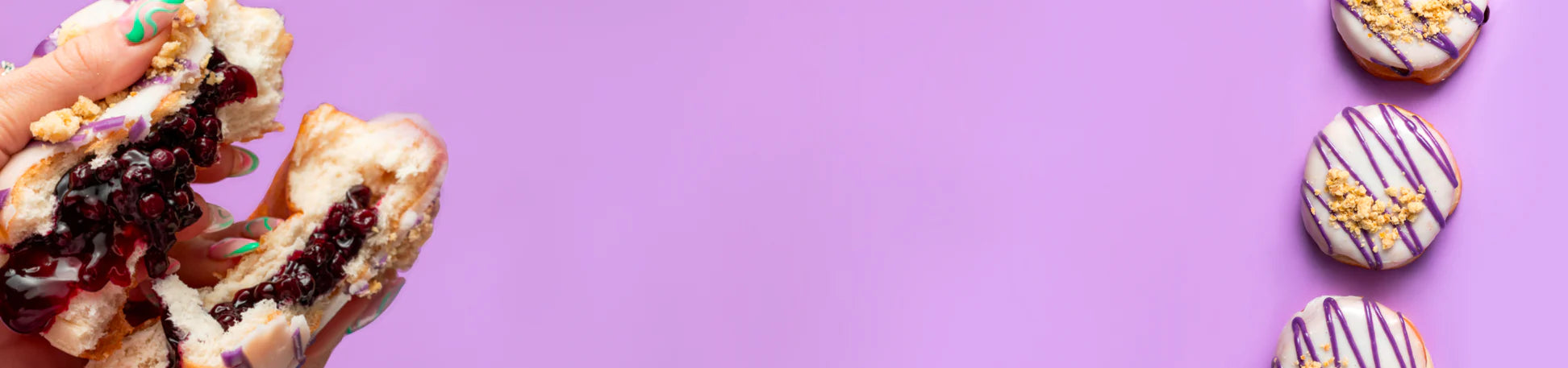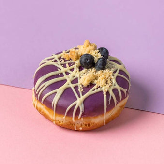 🌱 VEGAN - Ball donut filled with blueberry jam, dipped in a violet lemon glaze, decorated with white chocolate, vanilla crumbs and fresh blueberries.