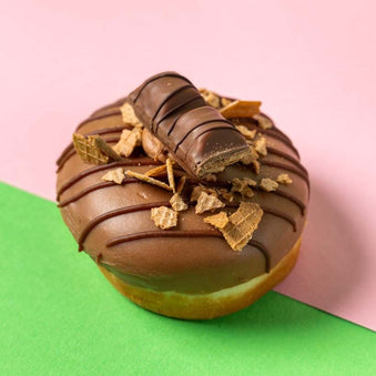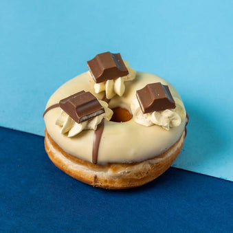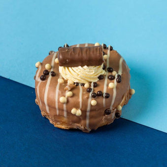 Filled ball donut with chocolate icing, caramel filling, topped with buttercream, Twix, white chocolate and caramel crispies.