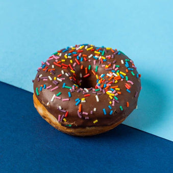 🌱 VEGAN - Dipped in vegan chocolate icing and sprinkled with original Jimmies Sprinkles.