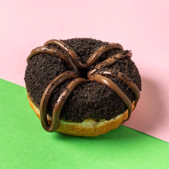 Ring donut dipped in chocolate icing, rolled in Oreo crumbs, decorated with Nutella and silver glitter.