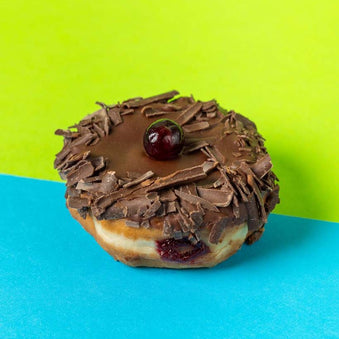 🌱 VEGAN - Ball donut, filled with cherry jam, dipped in chocolate icing, decorated with chocolate shavings and a cherry.