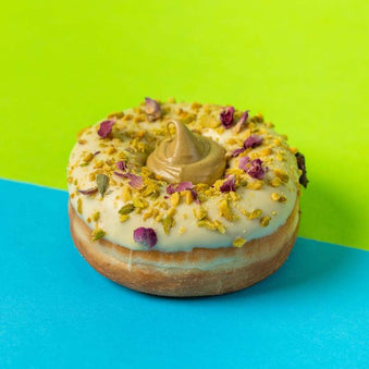 A glaze of white chocolate and pistachio, filled with pistachio cream and decorated with pistachio pieces and rose petals.