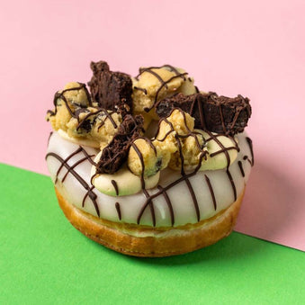 🌱 VEGAN - Ring donut with a cream icing, buttercream, light and dark cookie dough pieces and chocolate drizzle.