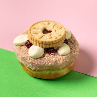 🌱 VEGAN - Ball donut filled with raspberry jam, dipped in strawberry glaze, dipped in wafer crumbs, and decorated with more jam, buttercream and a Jammie Dodger cookie.